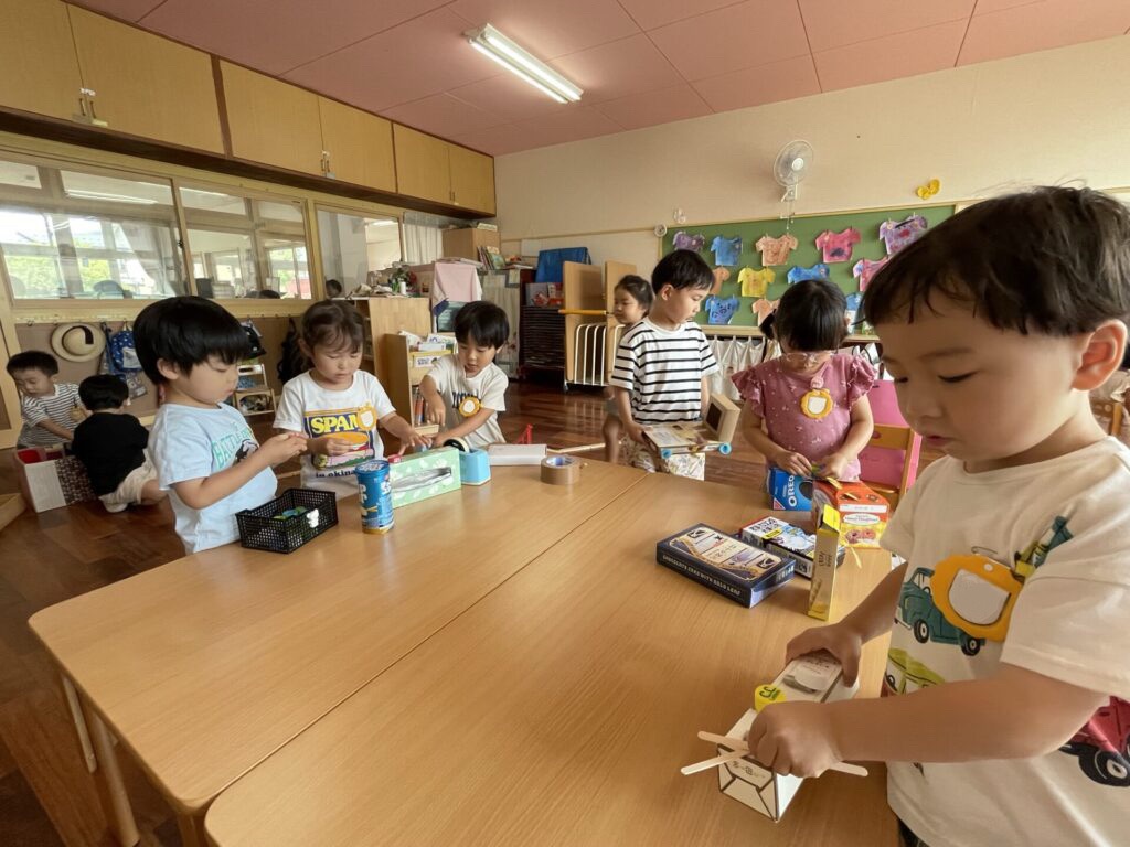 ご家庭から持ってきていただいた廃材を使った廃材遊びを行ってみました。ガムテープやセロハンテープで、箱を繋ぎ合わせていきました。