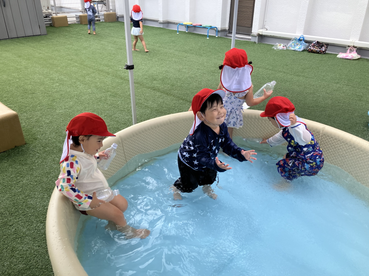 まだまだ暑いので…屋上で水遊びを実施しました!蒸し暑い中だったので冷たい水がとても気持ちよく、バシャバシャと水しぶきをあげながら楽しんでいました。夏休みの間にも水遊びをたくさんした子が多かったのか、水にすっかり慣れてダイナミックに動く姿が見られました。
