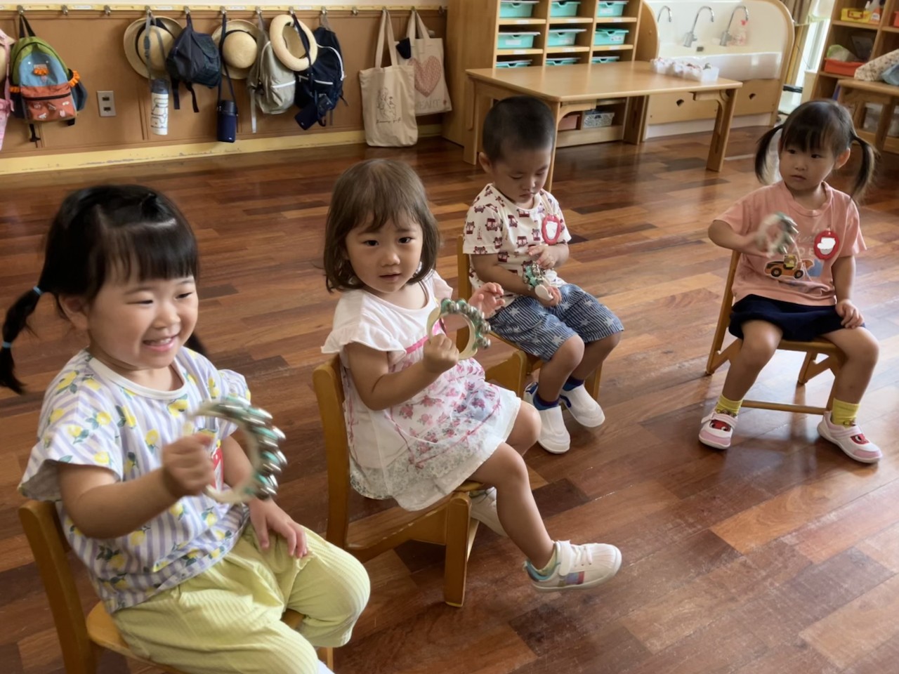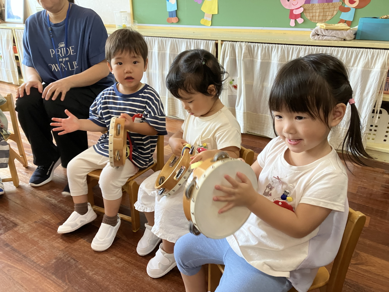 初めての楽器遊びもしました!タンバリンと鈴を用意すると、興味津々の様子で触ったり鳴らしたりして楽しみました。最後に「さんぽ」をピアノで弾くと、リズムに合わせて元気に演奏することができました!またしましょうね♪