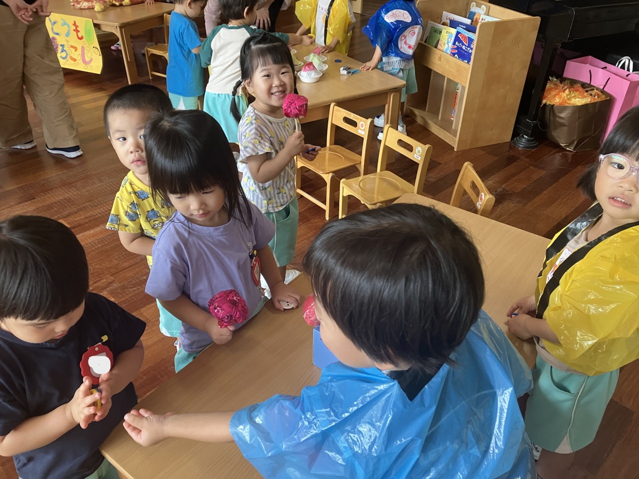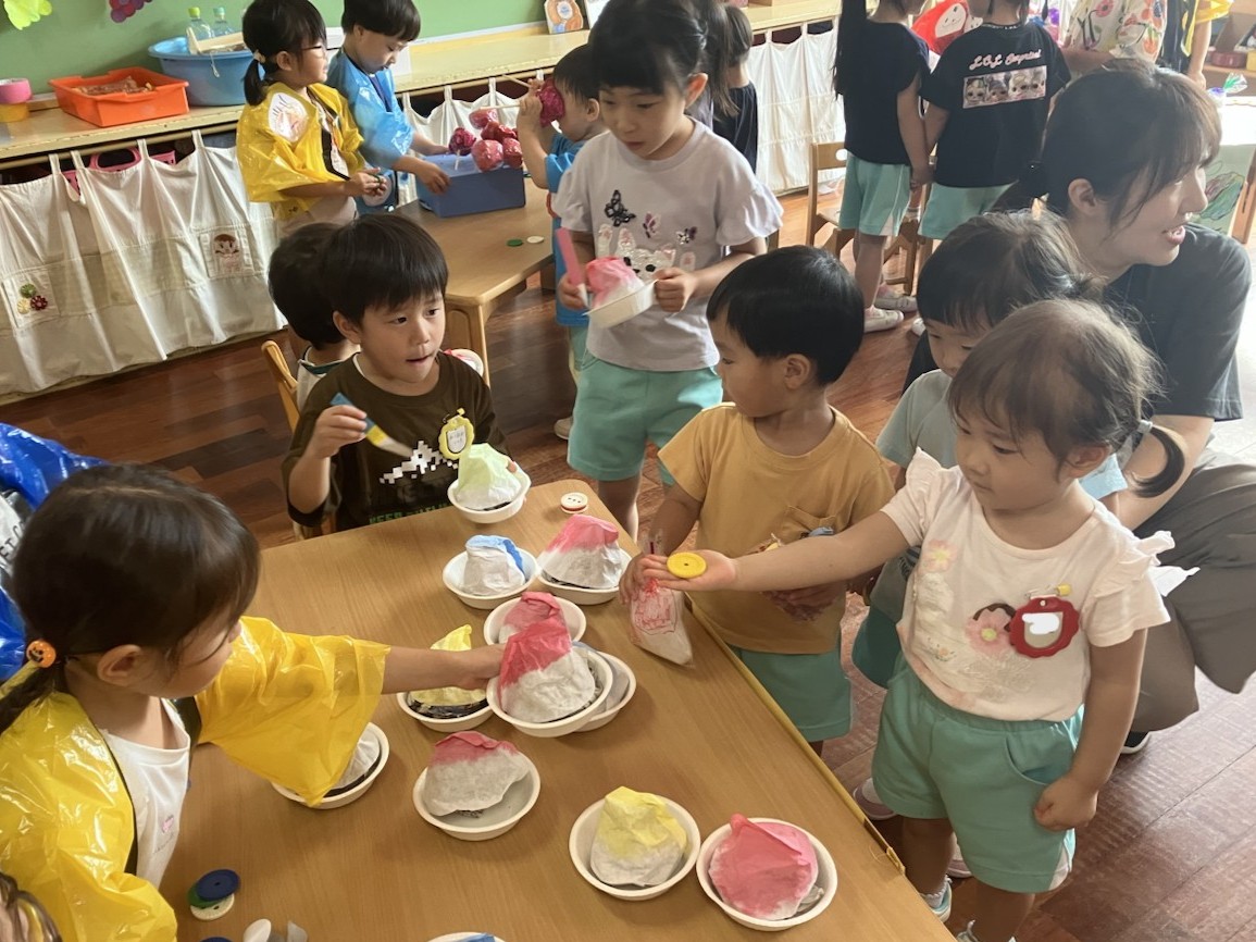 また、たんぽぽ組のお兄さんお姉さんが楽しんでいるお祭りごっこに招待をしてもらいました。かき氷やりんご飴、まとあてや輪投げなど、楽しそうなお店に目を輝かせながらやり取りを楽しむことができました。