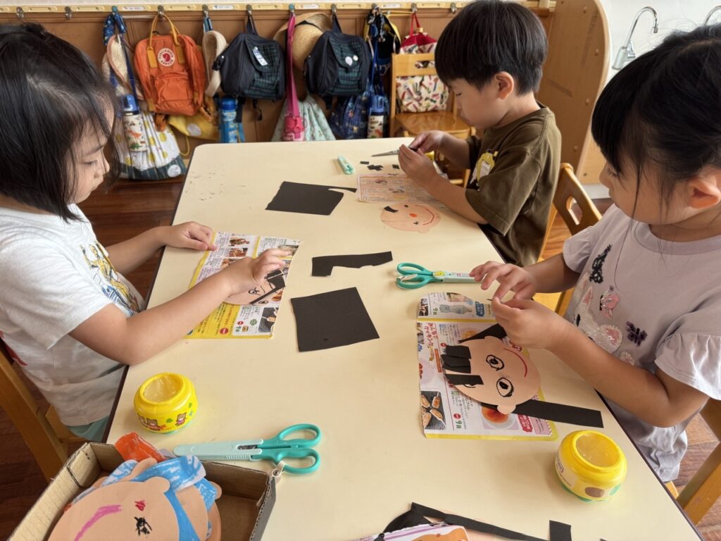 はさみや糊を使って自分の顔を作りました!