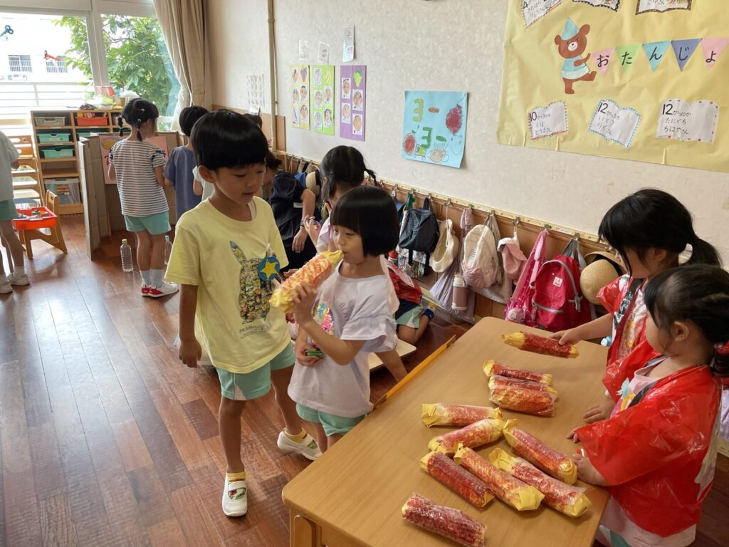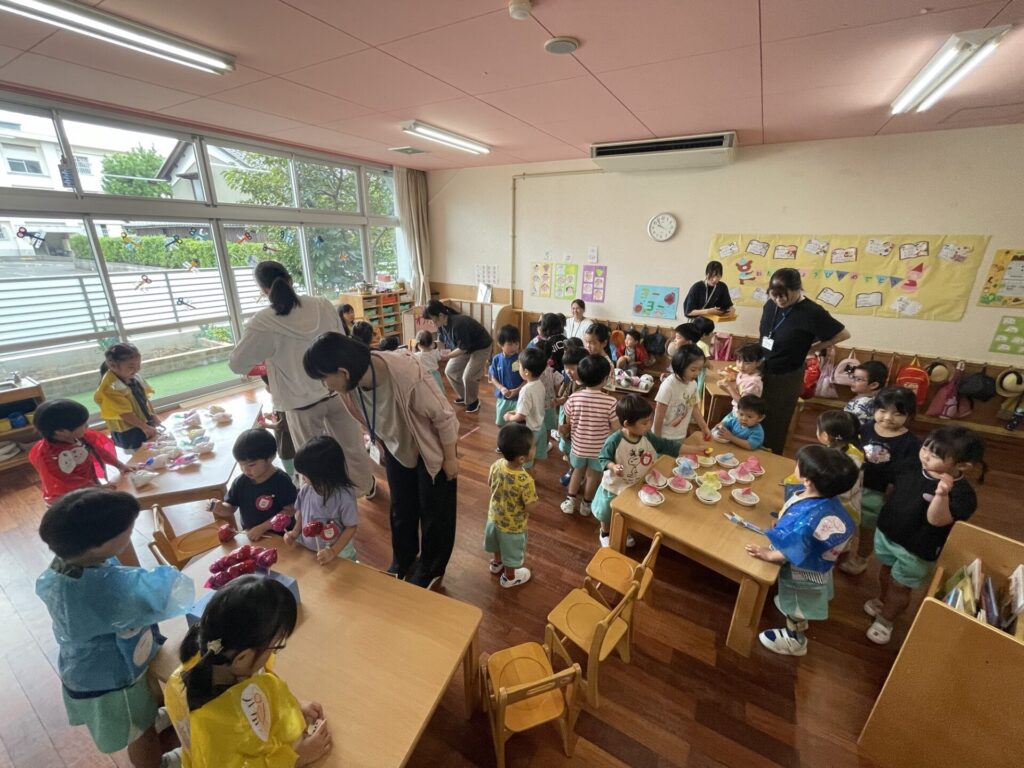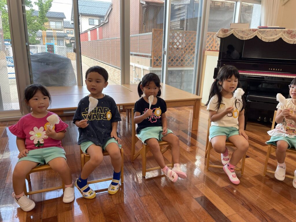 のびのびクラブや幼稚園のお友達にも来てもらい、お祭りごっこを楽しみました。たくさんのお客さんに緊張している様子もありましたが、「いらっしゃいませ!」と呼び込んだり、「こうやって遊ぶよ!」と実演してみたり…「これください!」と言われると嬉しそうにしていた子どもたちでした。