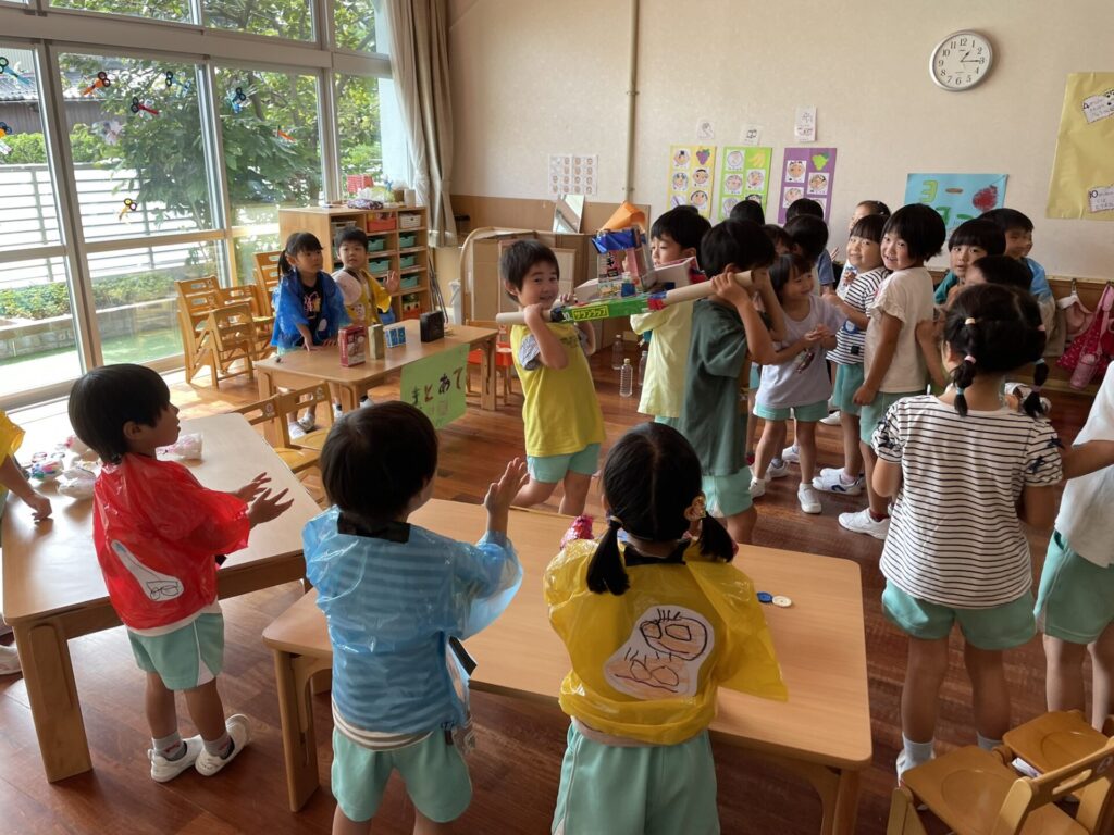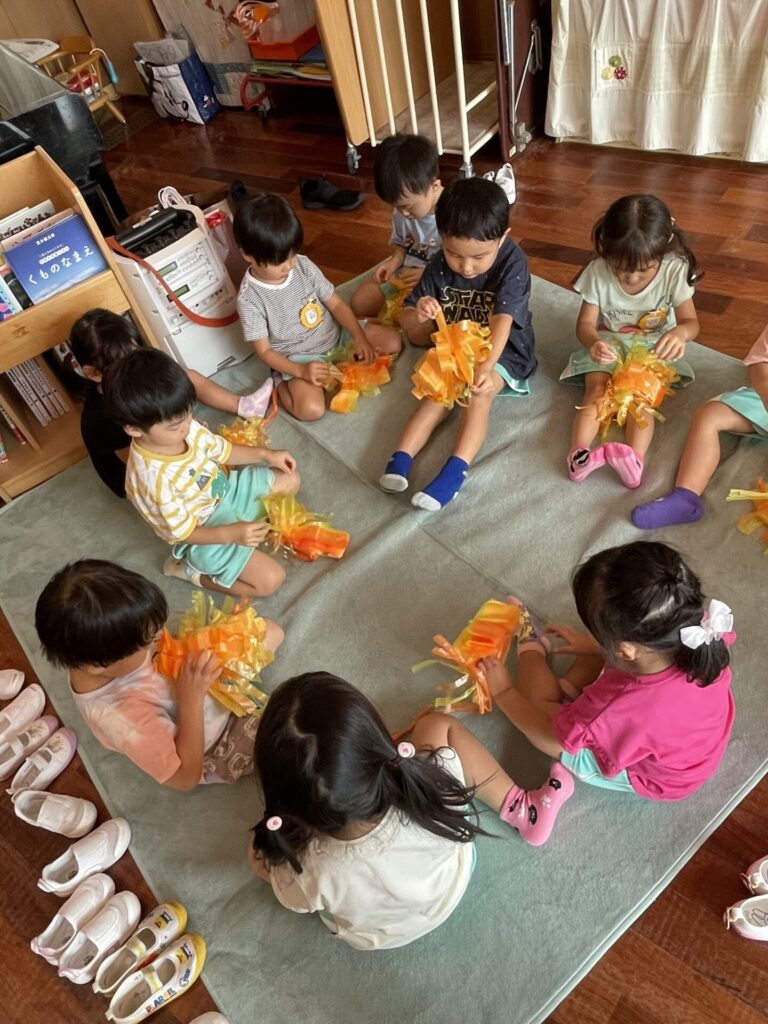 見通しを持てるようになってきた子どもたちが安心して、そして期待をもって登園できるように願いを込めて、2学期から今後の予定の確認をしています。来週には運動会の見せあいっこを控えています。そこで、運動会があること、みんなもその時、ダンスや体操をすることを話すと「fun!fun!fun!がいい!」と話してくれました。そこで、ポンポンを作ったり、みんなの顔が見えた方がうれしいよね!とマークの上で踊ったり、本格的に取り組みが始まりました。どの子も、のびやかに嬉しそうに取り組む姿が素晴らしいです!