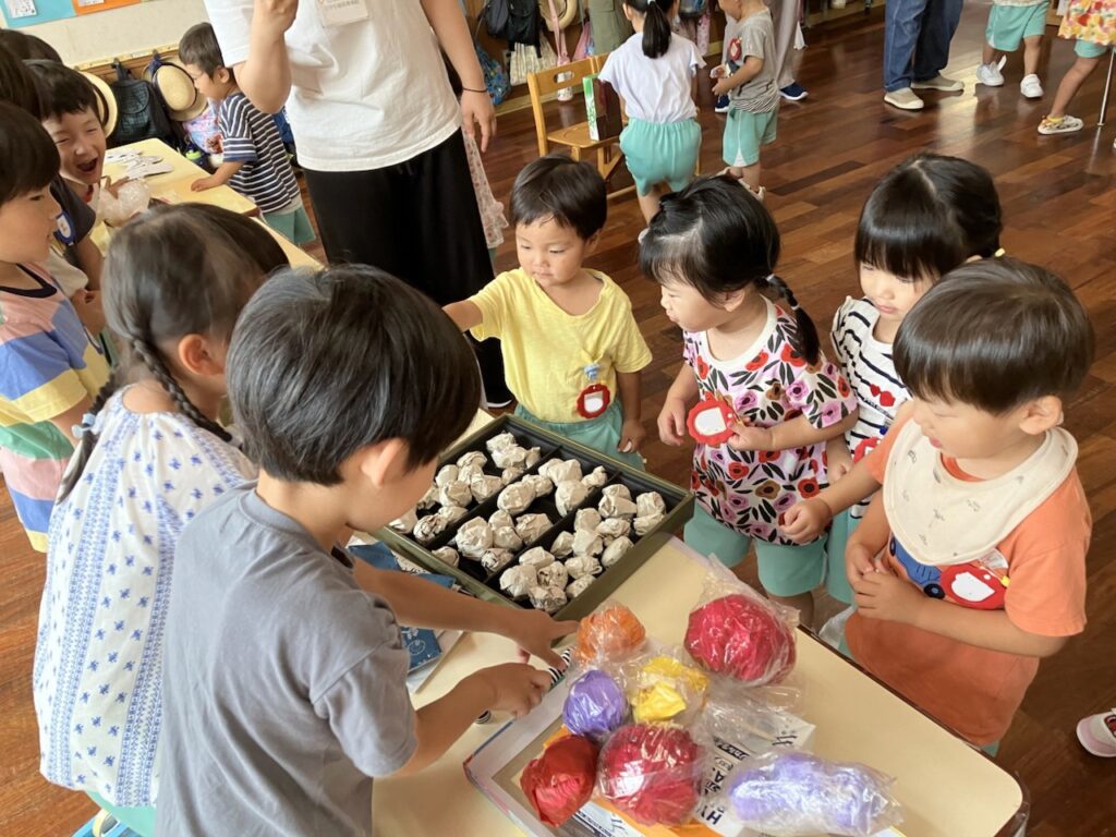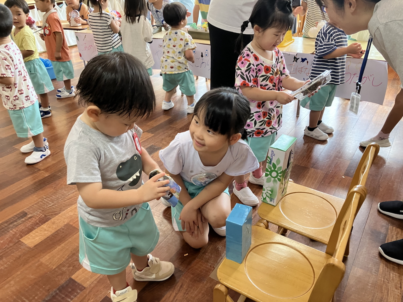 また、ひかり組さんがお祭りごっこに招待してくれたので行ってきました♪ことり組さんに遊びに行った経験を思い出し、自分たちからお店に走って行ったり、お金を手渡したりすることができました。