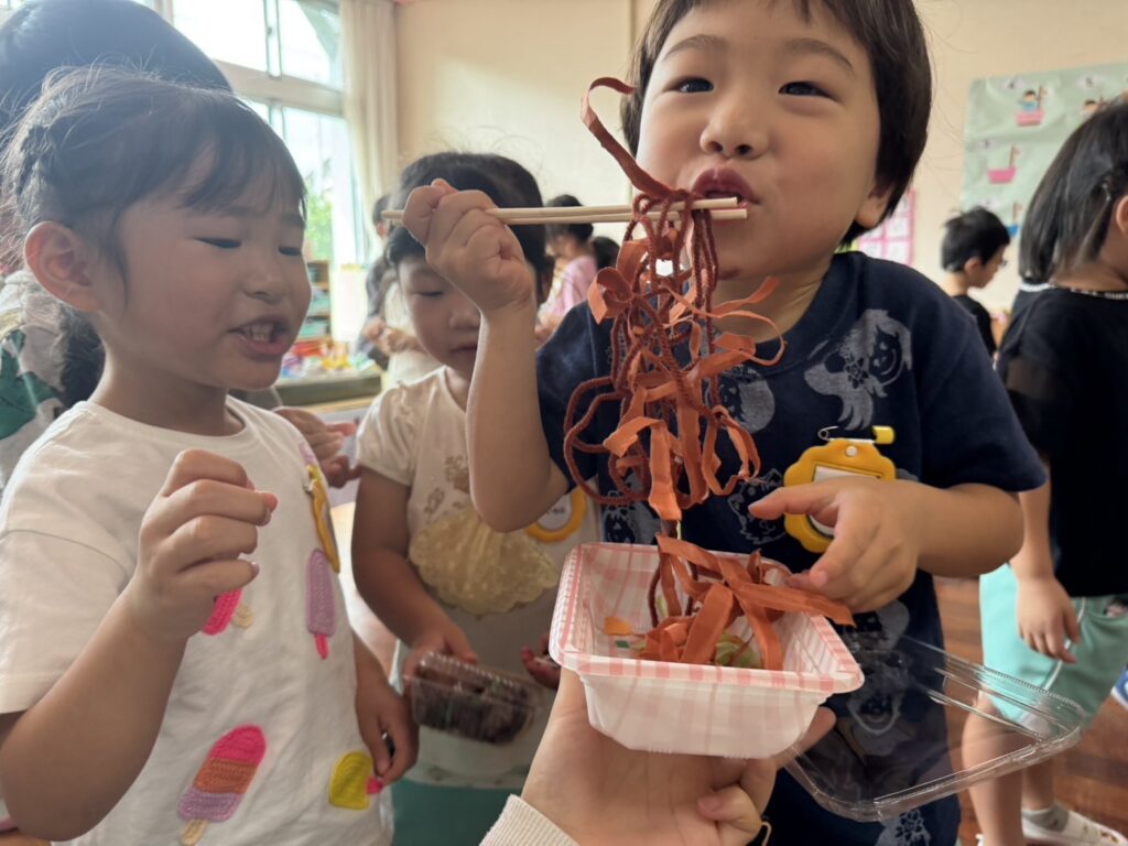 金曜日は、ひかり組さんがお祭りごっこに招待してくれました!お兄さんお姉さんが制作した焼きそばやたこ焼き、カステラは本物の様!
