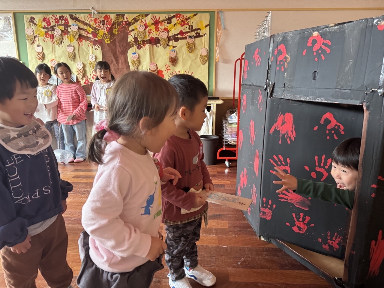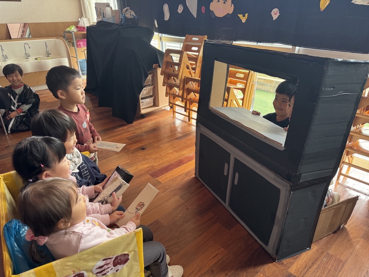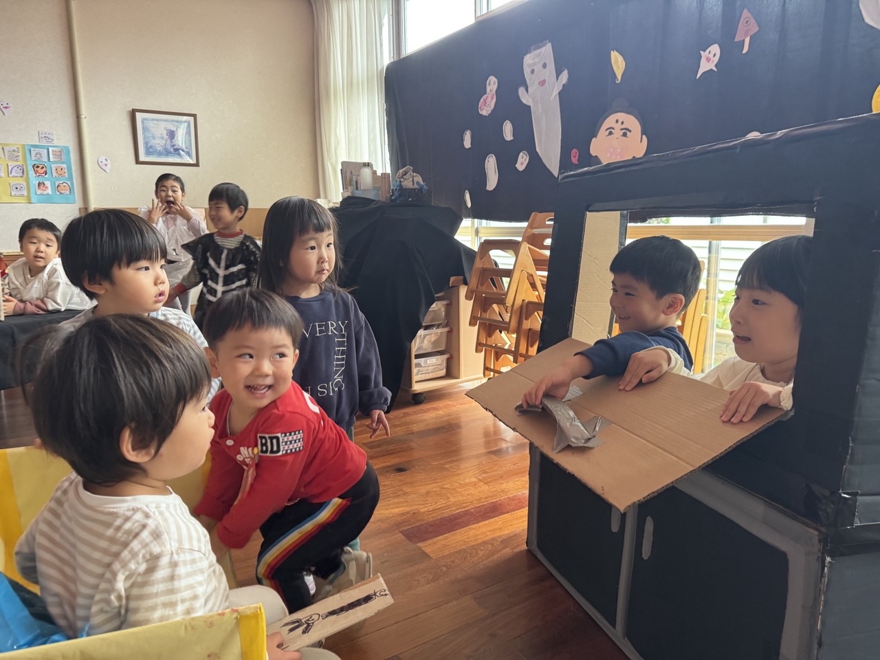 ことり組さんが制作していたおばけ屋敷👻お部屋がちょっと暗くなってお兄さんお姉さんがオバケに変身!みんなをおどろかそうと隠れていました。作った大きなテレビが置いてあり、リモコンでおばけチャンネルを入れると画面が急に開いて「わあ~っ」とオバケが出てきます。怖がって泣くのではと思いきや、まさかのリアクション無し‼びっくりする子どもたちの表情を想定していた教師が大爆笑でした。帰りの玄関でことり組をそっと覗きこむ姿も微笑ましかったです。