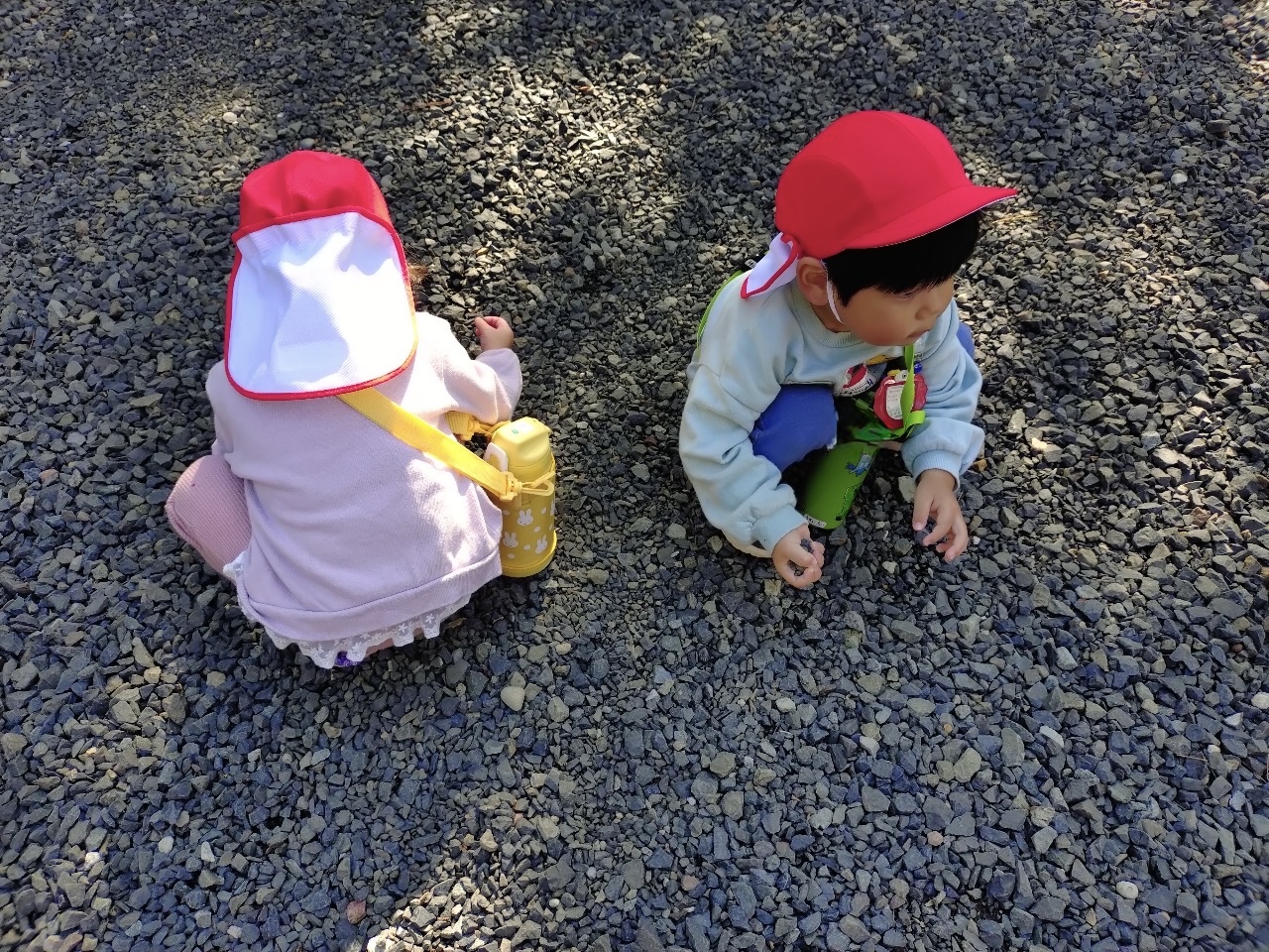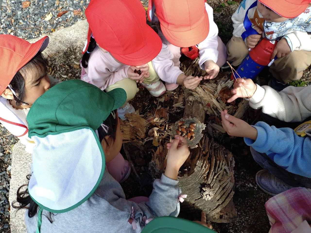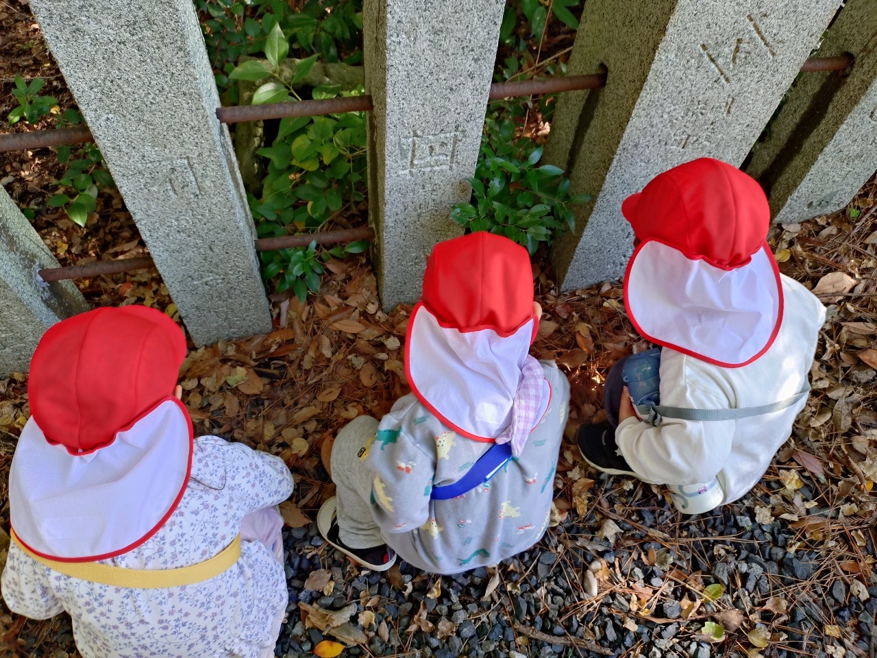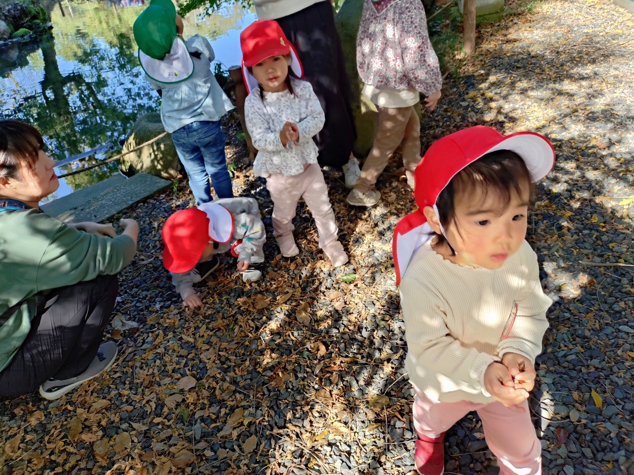 気比神宮では、池の鯉を見たり、木の実や色づいた葉をたくさん拾いました。小さな手にいっぱいどんぐりを持って「あったよ!見て」赤い木の実を「トマト🍅」と話したり心地よい日差しの中、秋を見つけて嬉しそうないちご組さんでした。