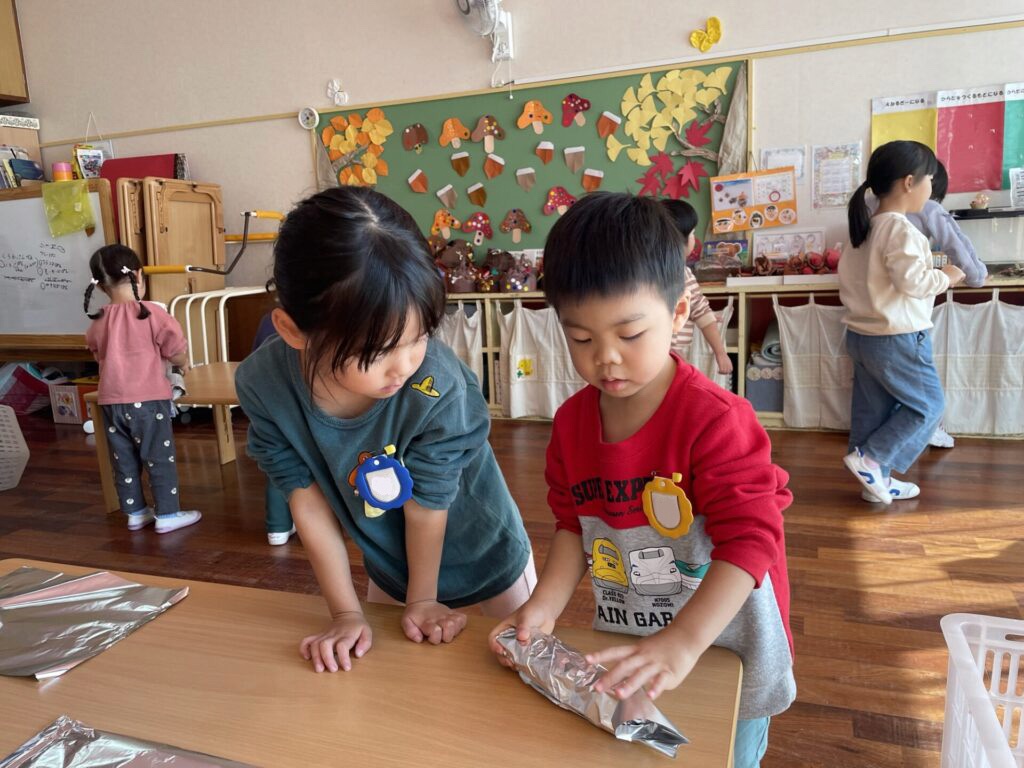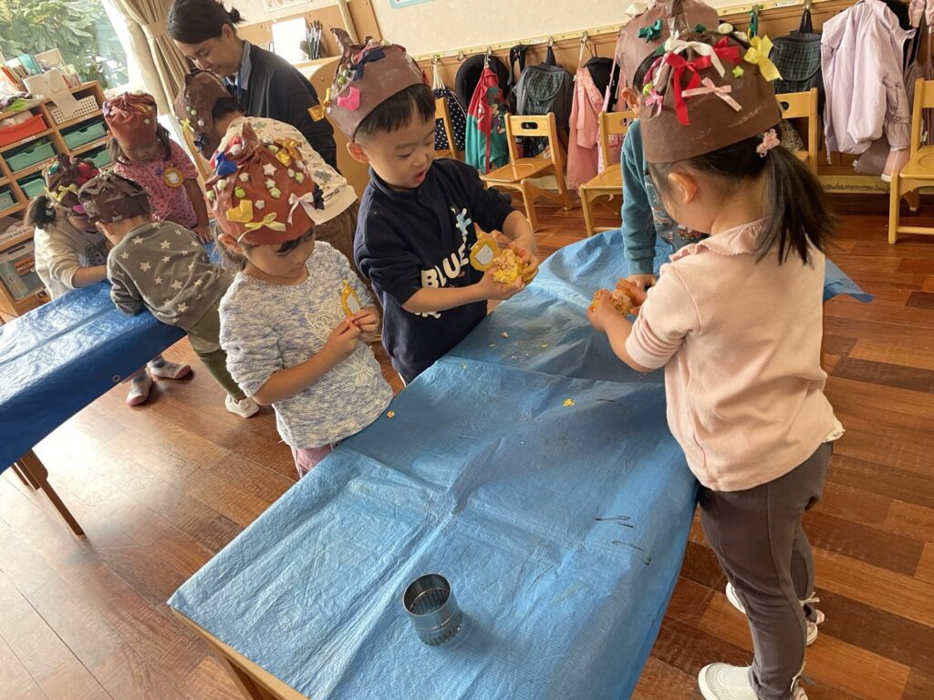 週の終わりには焼き芋パーティーもありました。異年齢グループに分かれ、お兄さんお姉さんに教えてもらいながら焼き芋の準備をしたり、幼稚園のみんなで焼き芋じゃんけんを楽しんだり自分でおにぎりを作ったり…うれしいことが盛りだくさんでした!いろいろな友達と食事を分かちあい、「おいしいね!」「もっと欲しい!」と喜んで食べる姿がほほえましかったです。