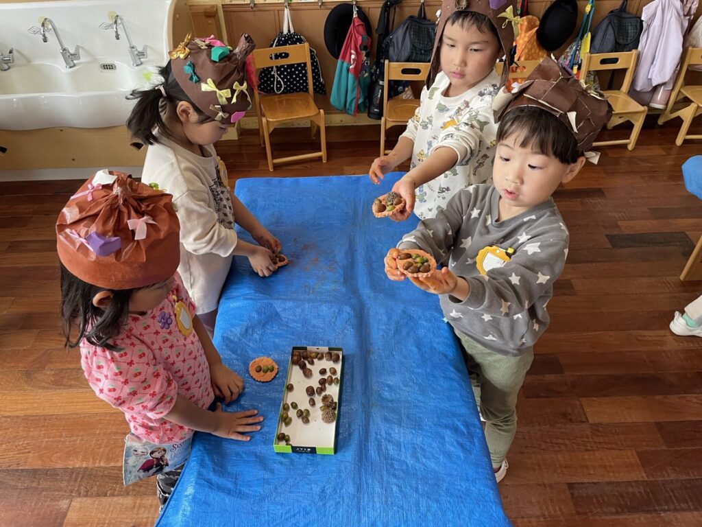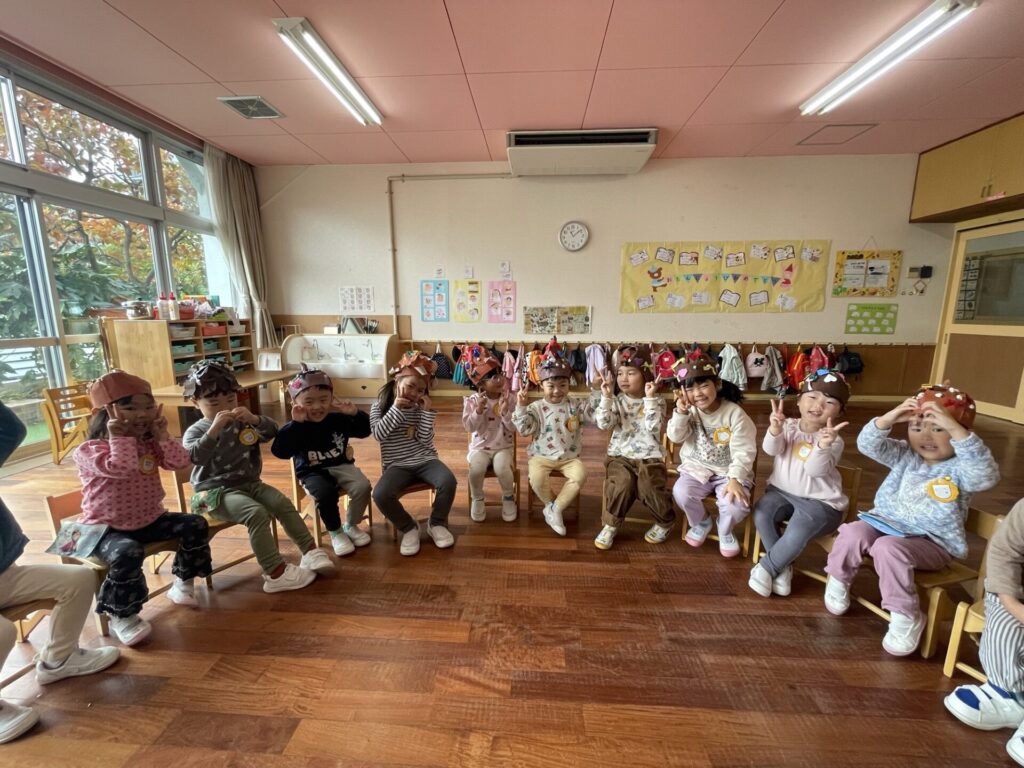 また、全員の「どんぐり帽子」が完成!☆ みんなでかぶり「こだわりポイント」を発表しました。最初は「こだわり?」と初めて聞く言葉に?マークが浮かんでいましたが、教師の説明も聞き「〇〇ちゃんのこだわりポイントはお星さまです…」「ハートです!」等、自分たちで選んだ飾りを思い出しながら、照れくさそうに嬉しそうに話す姿が微笑ましかったです。