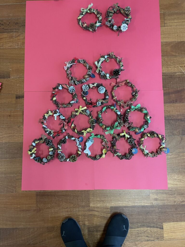 週の初めには、再来週に始まるアドベント(クリスマスを楽しみに待つ期間)のことを子ども達に話し、アドベントカレンダーの準備を行いました。カレンダーに使うのは、芋ほり後に作ったあのリースです!個々にリボンを巻いたり、飾りづけをしました。喜びいっぱいにアドベントの準備をすることができました。アドベントが始まるのが楽しみですね!