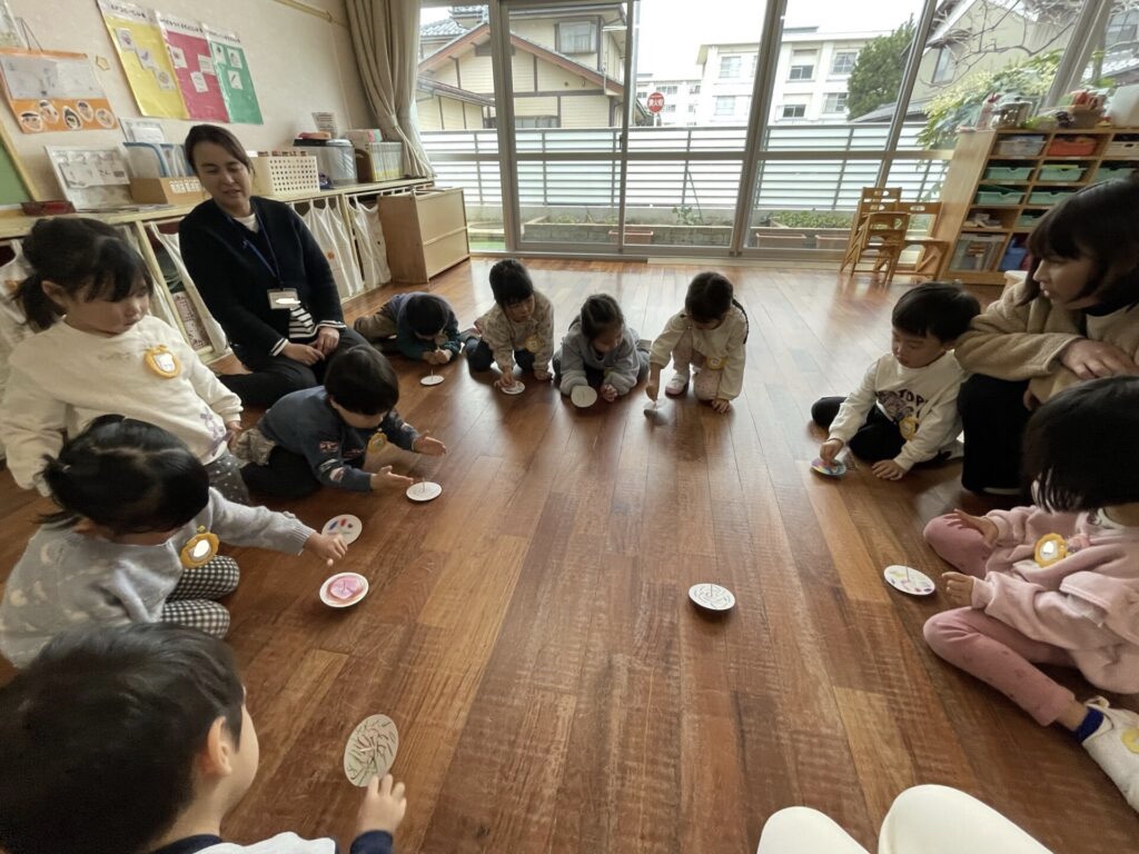 『お正月遊び』と題して、「コマの制作」や「駒遊び」「福笑い」「郵便ごっこ」を、いま楽しんでいます。