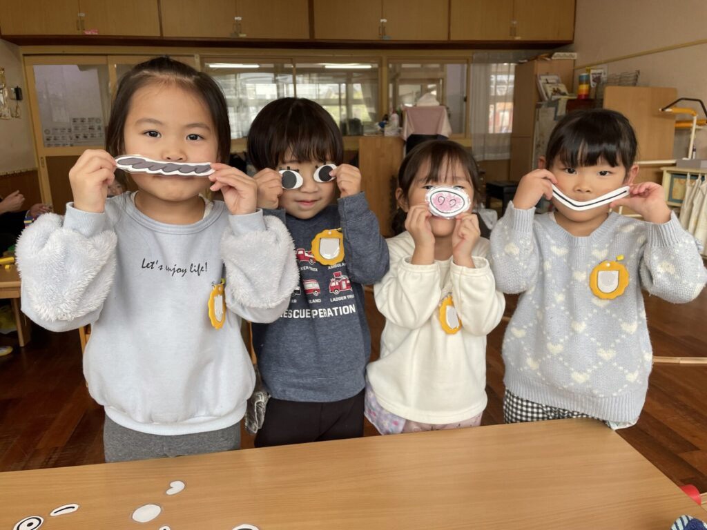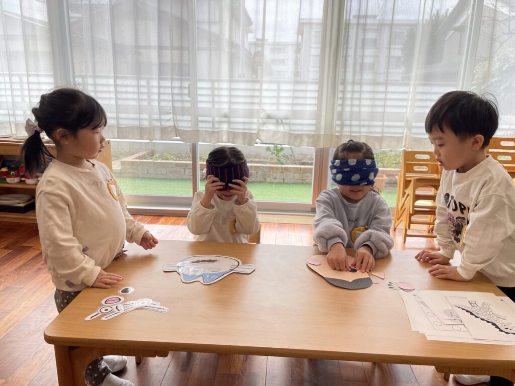 福笑いでは、目を隠し「こっちに口だよ」と、どこのパーツなのか友達に教えてもらいながら、協力して遊びました。