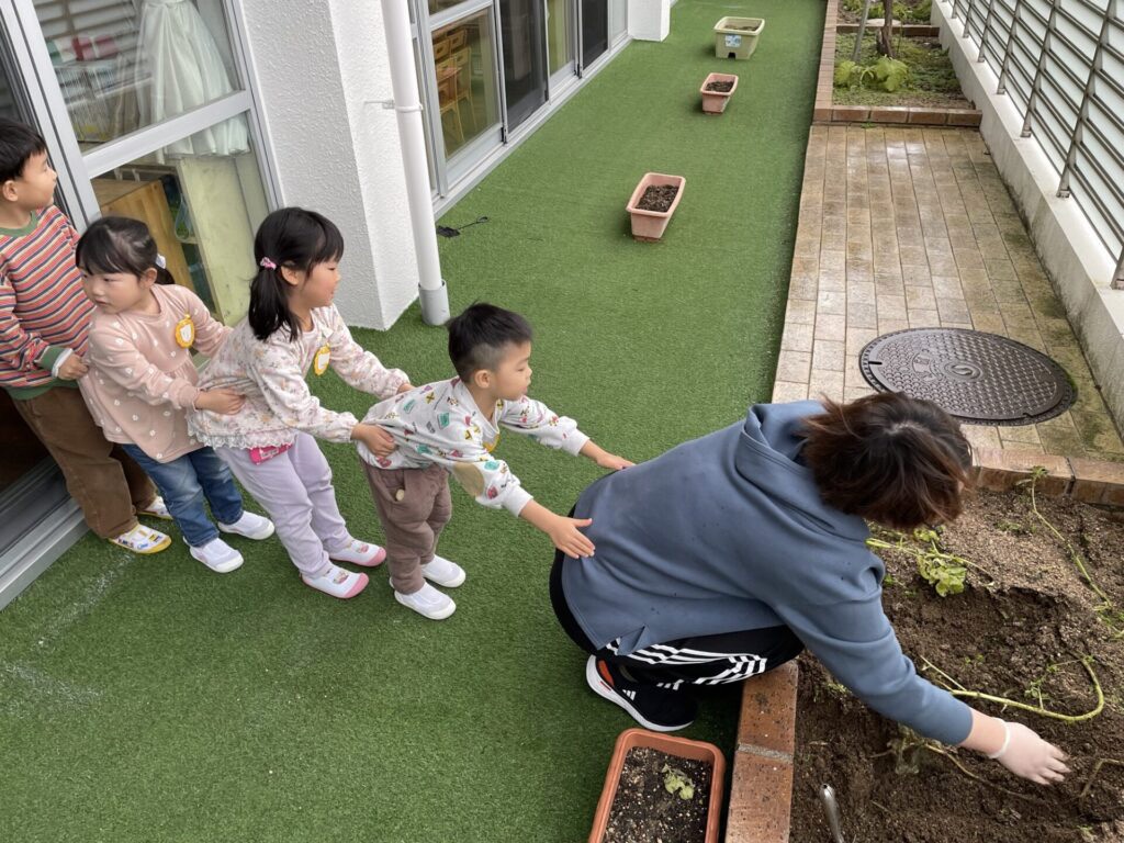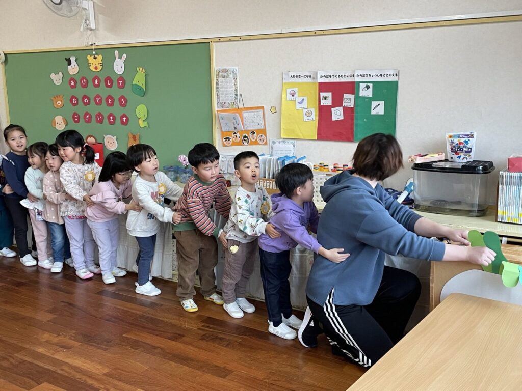 教師が画用紙で作ったかぶを教師が引っ張って、「〇〇ちゃん、手伝って!」とお友達を呼びに行き、声をかけられた友達が後ろにつながり「うんとこしょ、どっこいしょ!」
