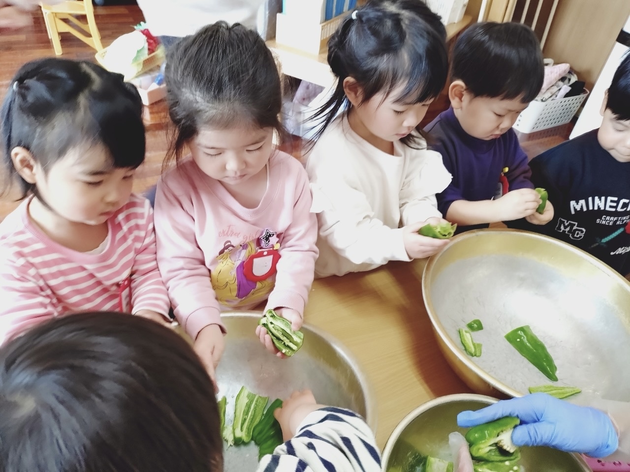 生のピーマンの独特な匂いが苦手なのか、「もう終わり!」と手を洗いに行く子も。