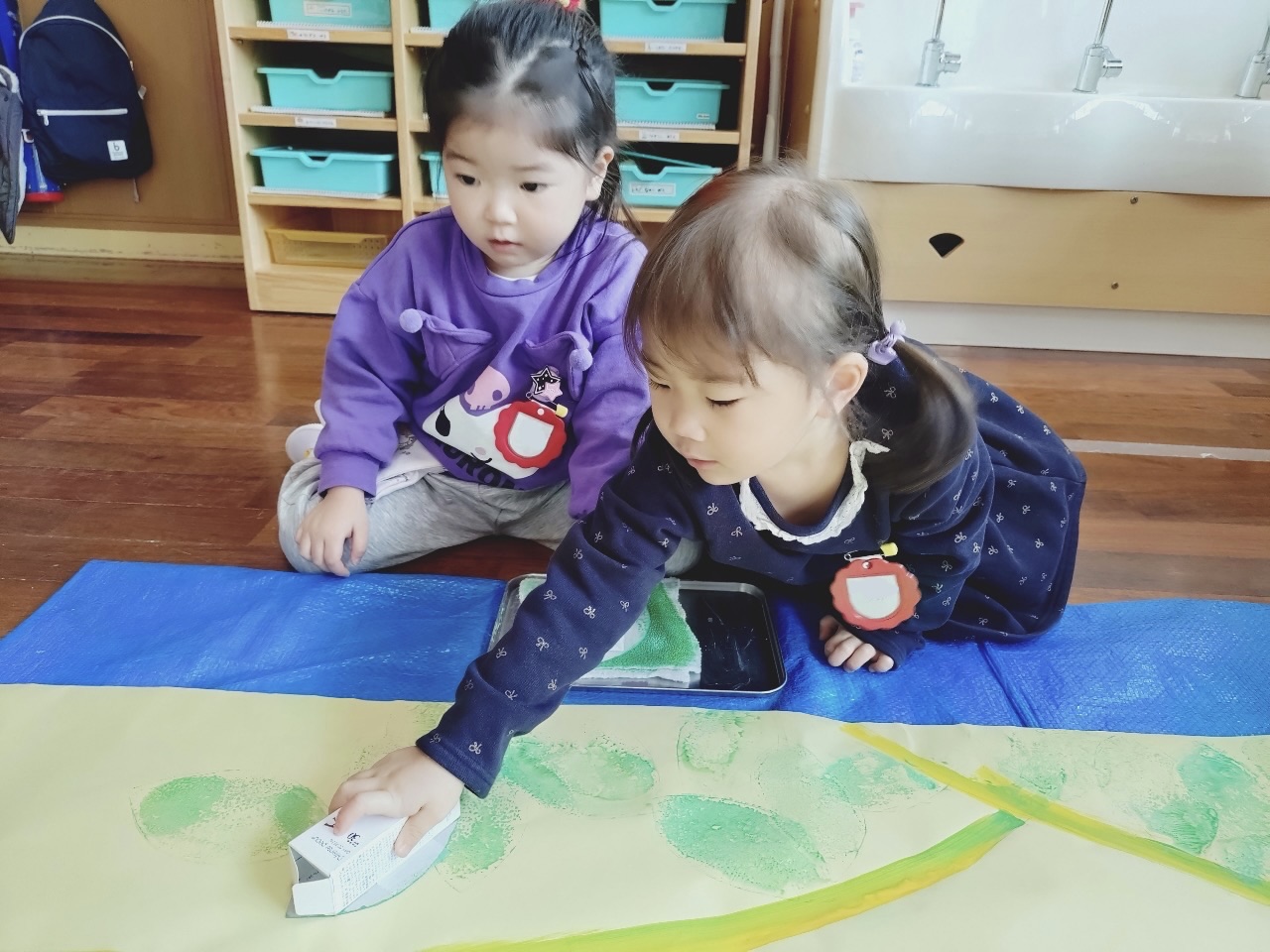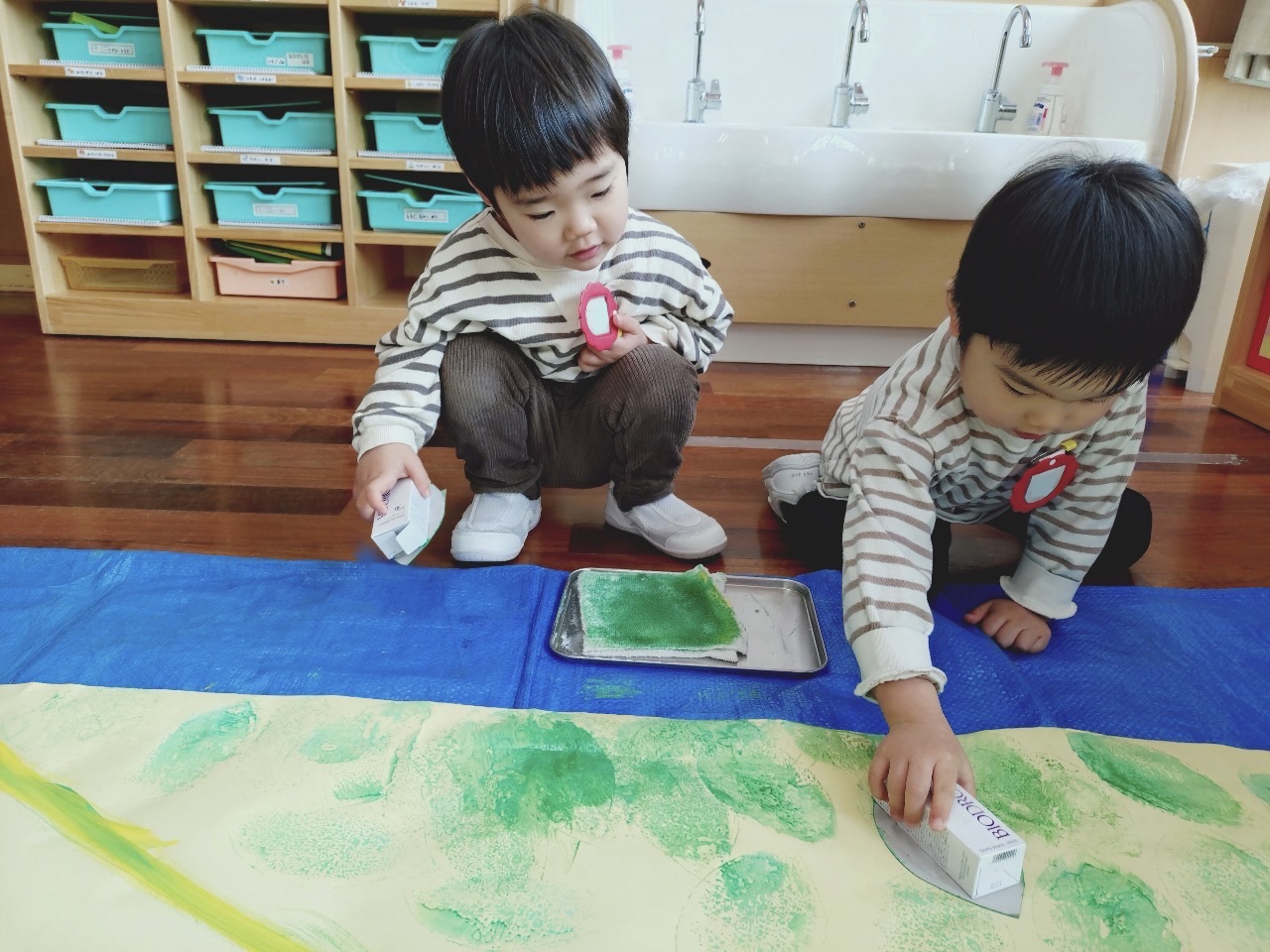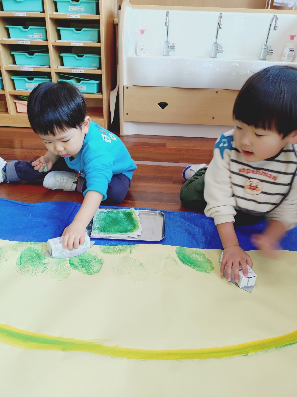 大きな紙にスタンプで色をつけたり、色々な素材の材料を準備して、