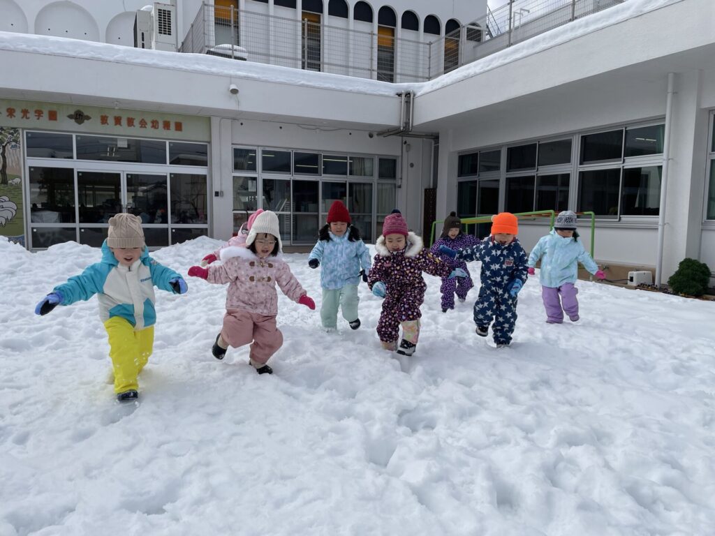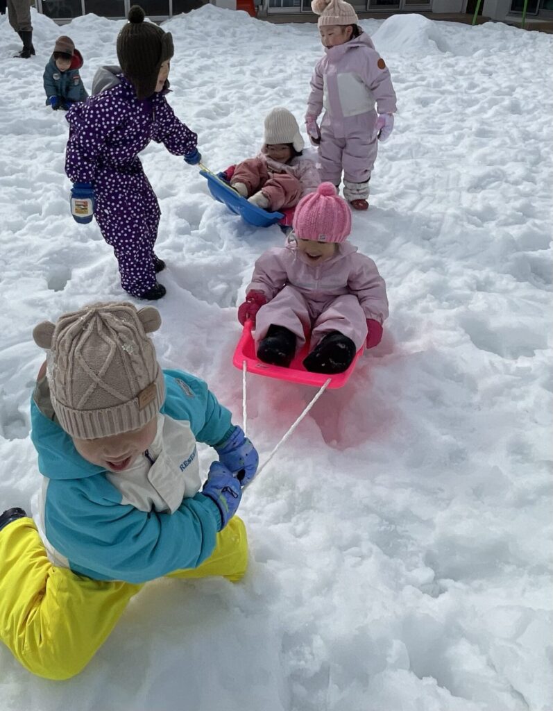 園庭に残っているたくさんの雪で、雪合戦やそり遊び、かまくらを作りなど思う存分遊びました!柔らかく深い雪…大人は足を取られますが、子どもたちは軽々走り、舞うように雪上を進んでいきます。