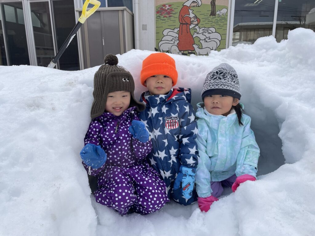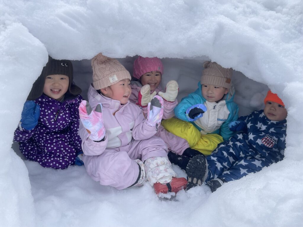 かまくらをどんどん広くすると「〇〇ちゃんも入れるよ!」「来て!」等友達と入る姿が微笑ましかったです。
