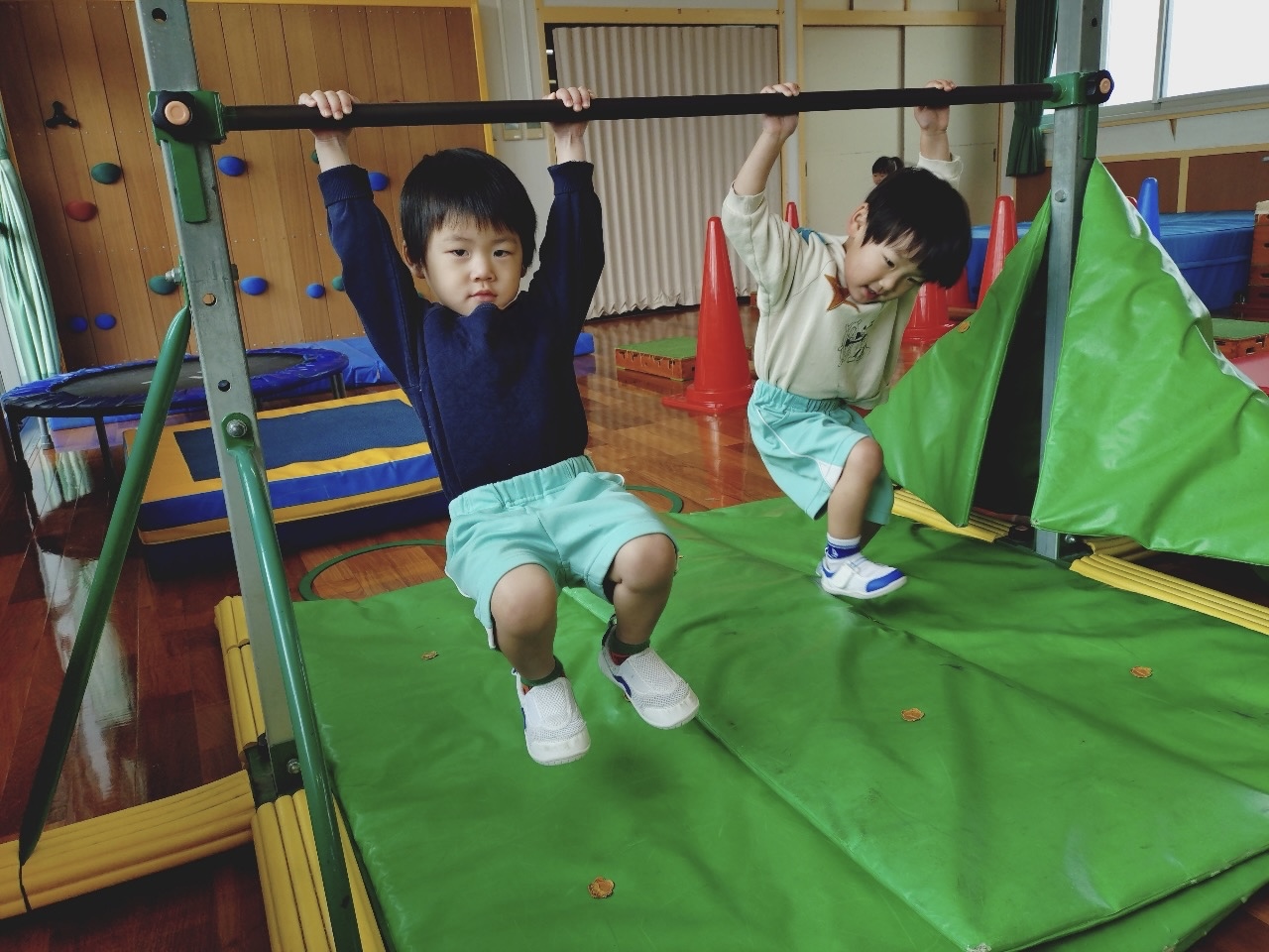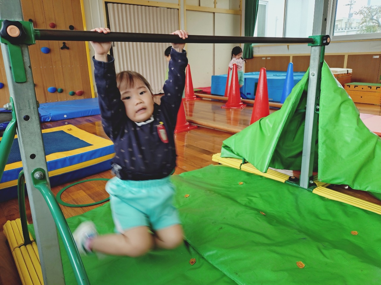 鉄棒でのぶら下がりは、足をキュッとまげて体重を支えます。