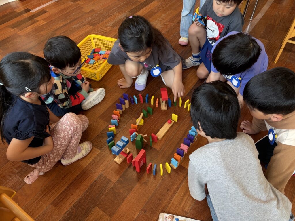 初めて使うおもちゃをみんなと一緒にやってみたり