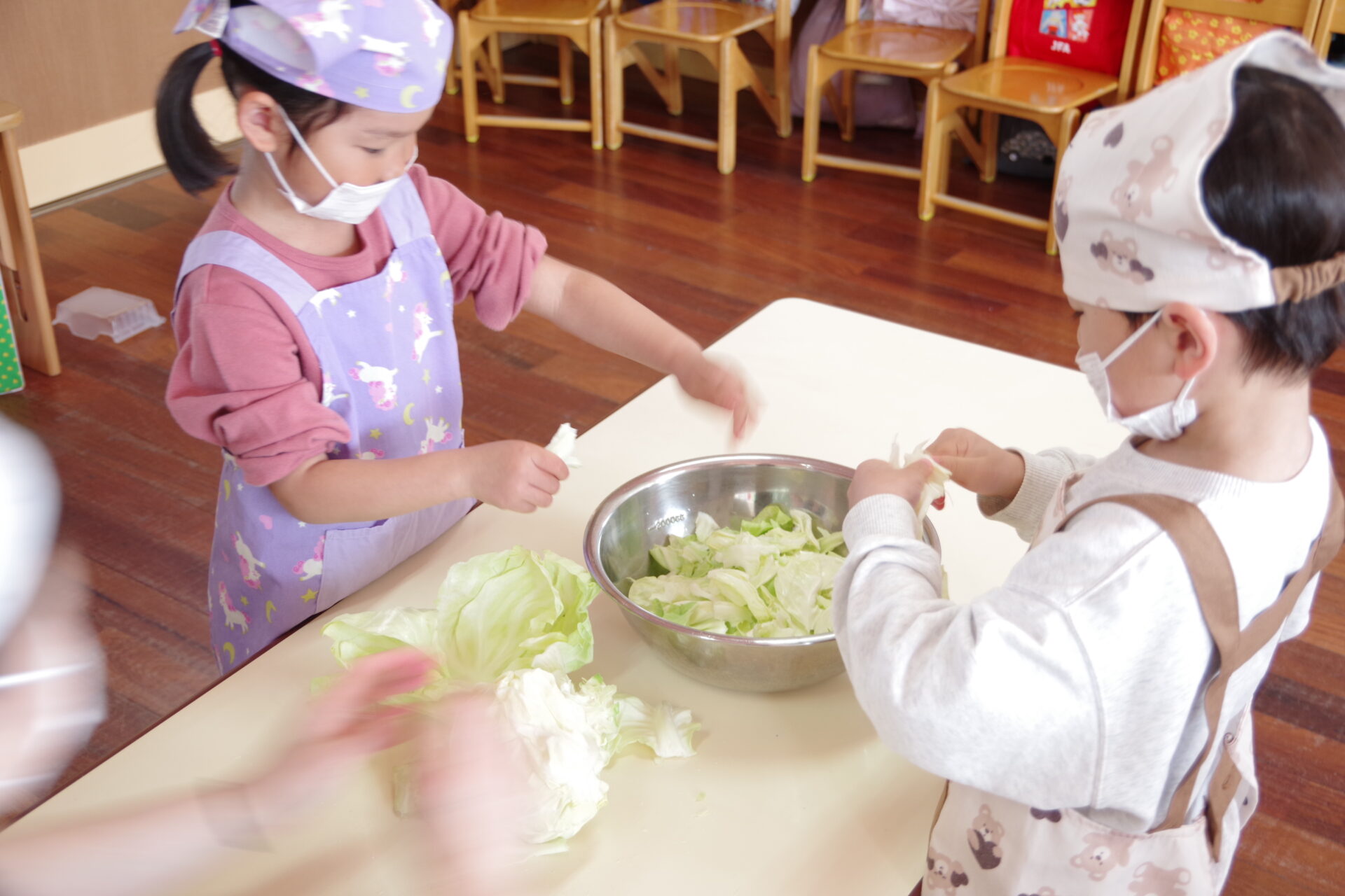 そしていよいよ、スープ作り!!春キャベツ、新玉ねぎ、新じゃがいもなどの春野菜に実際に触れ、香りを感じながら、五感をたっぷりと使って下準備を行いました。