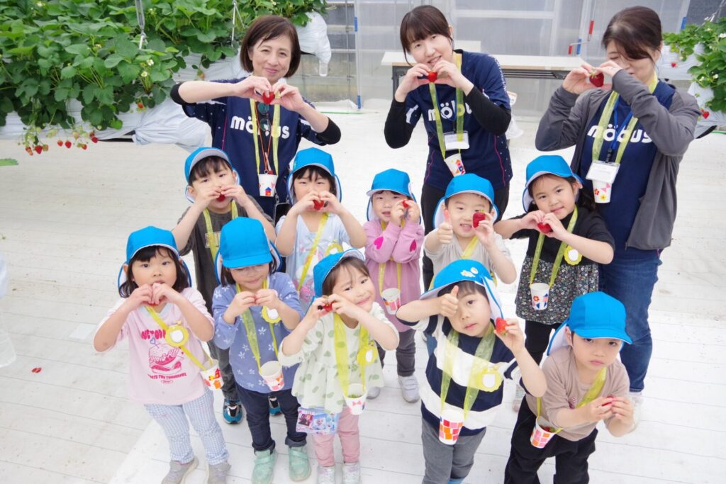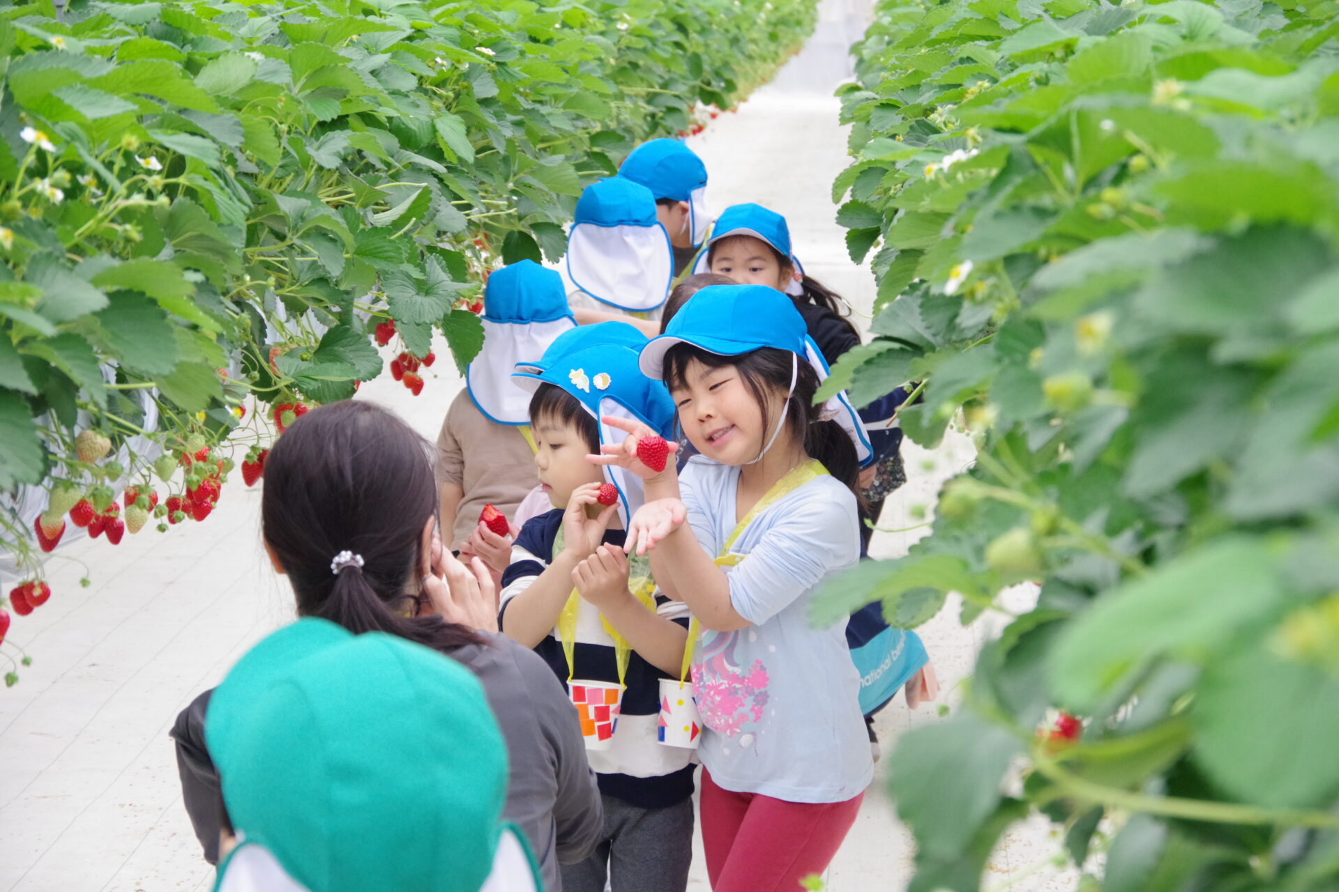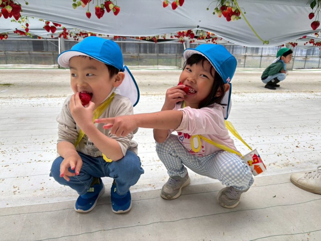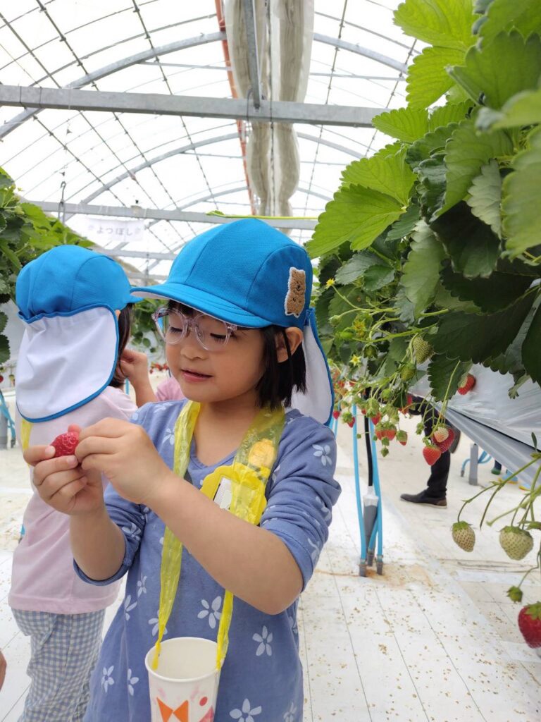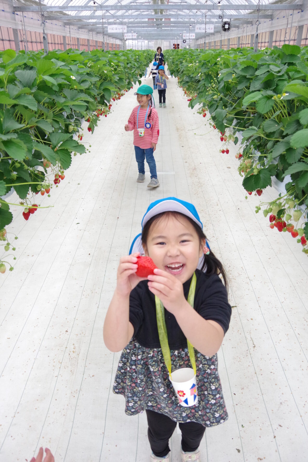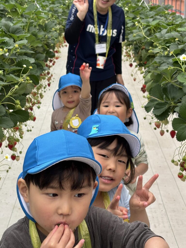 幼稚園バスに乗っていちご狩りに出かけました!!バスの中でもワクワク・ウキウキが止まらず、おしゃべりに花が咲いていました!!いちご園に到着し、大きなハウスの中に入ると、甘い良い香りが充満しています。真っ赤に実ったいちごがたくさん並び、「わあ!」と目を輝かせ、笑顔がこぼれる子どもたち。大切に育てて下さった農園の方にご挨拶し、感謝のお祈りを捧げて、いちご狩りのスタートです!自分で大きくて美味しそうないちごを選んで摘み取り、その場でぱくりと頬張ると、「あまい!」「もうひとつ食べたい!」と嬉しそうな声が広がりました。