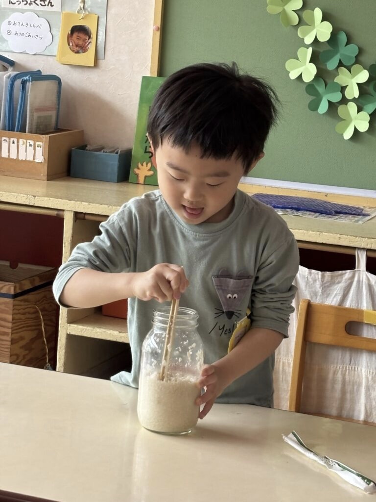 当日は、まず「塩こうじご飯」作りから始めました。かわりばんこでお米を研いで炊飯の準備…「なんでお水が白くなるの?」子どもたちの頭の中は「???」がいっぱい。ご飯が美味しく炊けるためにはいろいろな準備がいることを知りました。