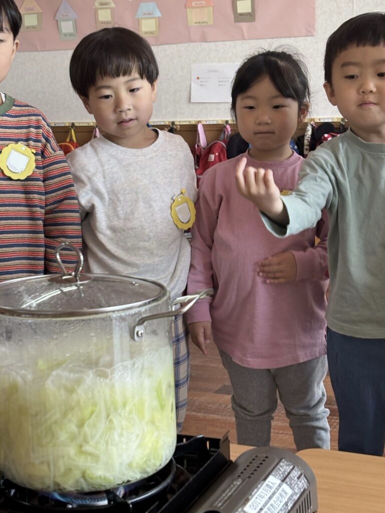 また、透明なお鍋(愛称はシンデレラ鍋(笑))を使い、お湯が沸騰する様子や、野菜が少しずつやわらかくなっていく様子をじっくり観察し、子どもたちの興味はますますふくらんでいきました。